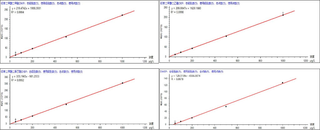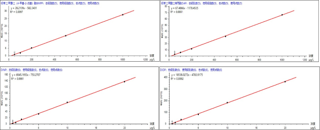According to the standard method, quantification was performed using the external standard method. For DINP and DIDP in the range of 1 μg/mL–20 μg/mL, the correlation coefficients (R²) were 0.9991 and 0.9992, respectively.For DNOP and DNP in the range of 0.1 μg/mL–2 μg/mL, the R² values were 0.9935 and 0.9922, respectively.For the remaining 15 PAEs in the range of 0.05 μg/mL–1 μg/mL, the R² values were all greater than 0.9921.Therefore, the linear correlation coefficients (R²) of all analytes were between 0.9921 and 0.9998. The calibration curves of selected compounds are shown in Figure 5, and detailed data are provided in Table 3.